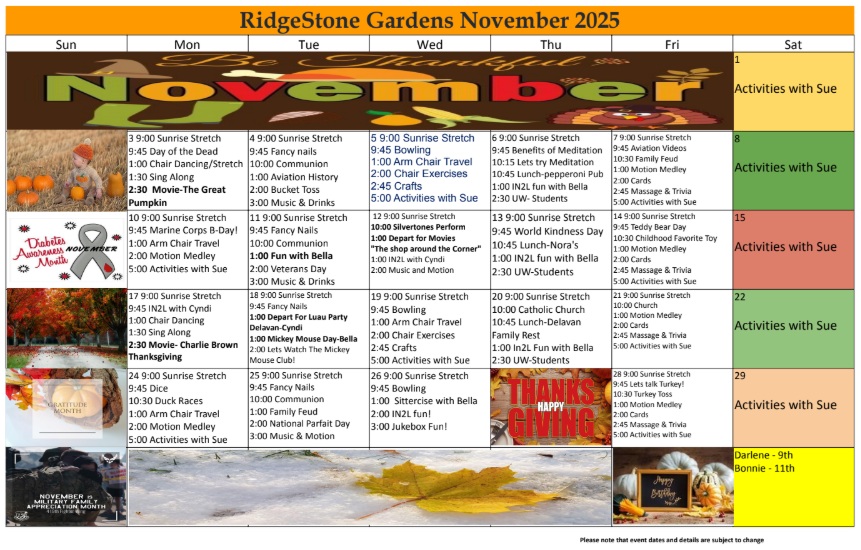 Zoom calls are available for all RidgeStone residents to talk virtually with their families. Call a manager to schedule.