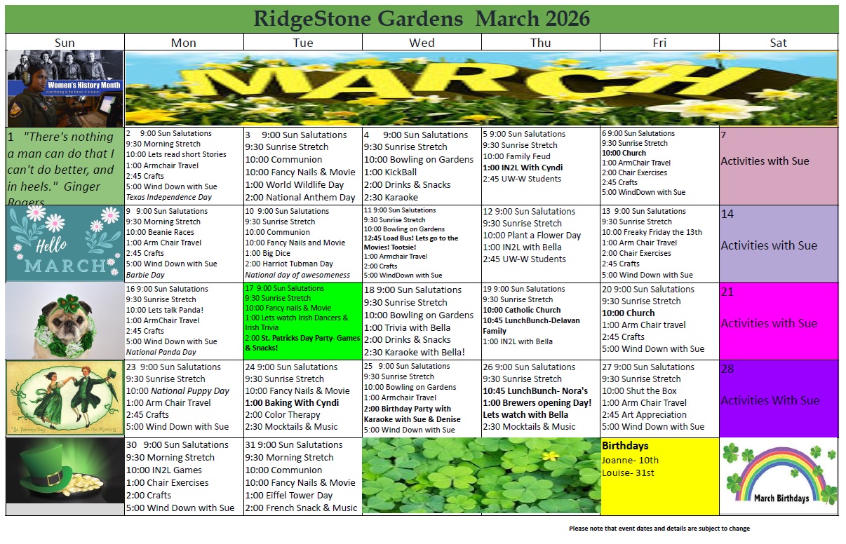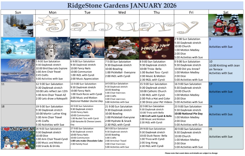 Zoom calls are available for all RidgeStone residents to talk virtually with their families. Call a manager to schedule.