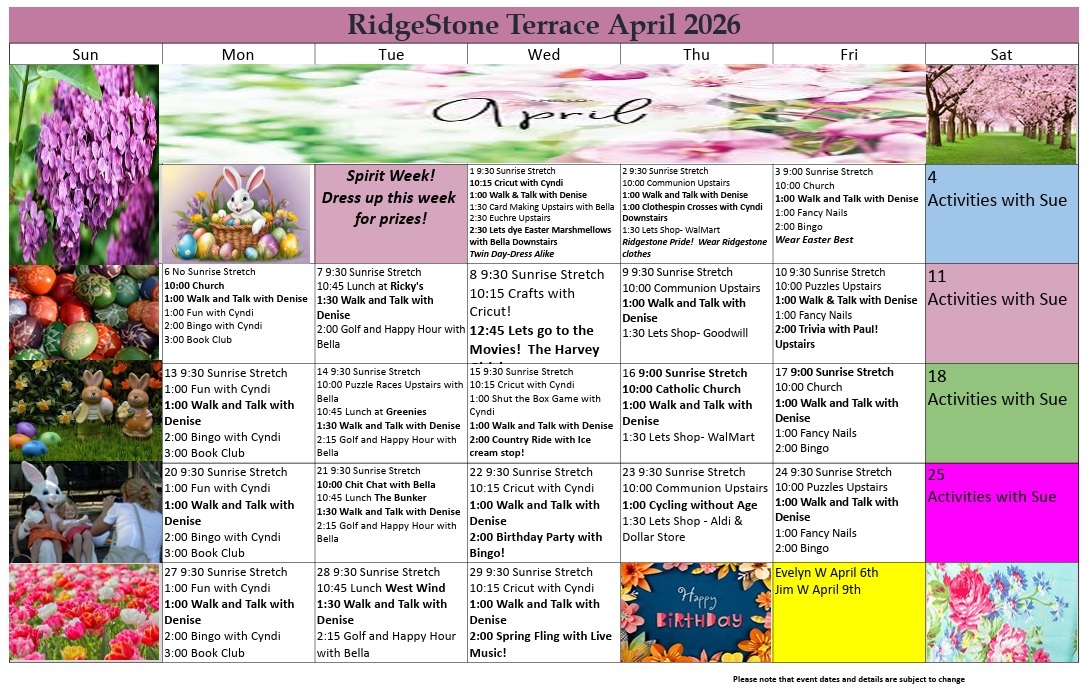 Zoom calls are available for all RidgeStone residents to talk virtually with their families. Call a manager to schedule.